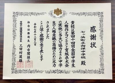 われらが向洋中学校に、法務局と人権擁護委員会から感謝状が送られました❗️
