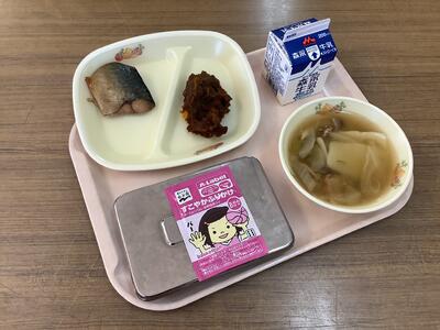 牛乳 ごはん 柚子香るさばの幽庵焼き🐟 冬至かぼちゃ🎃 はっと汁 おかかふりかけ