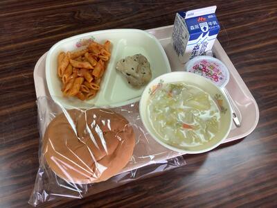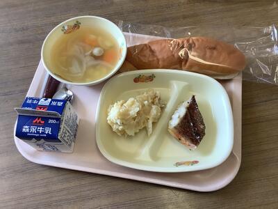 牛乳 米粉パン🥖 めばるのバジル焼き🐟 じゃがいものチーズ煮 コロコロ野菜スープ🍲