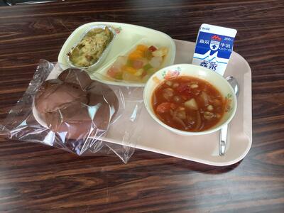 牛乳🥛 ココアパン🍞 七ヶ浜のりのりグラタン ポークビーンズ🐖 フルーツポンチ🍍