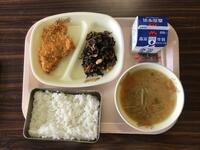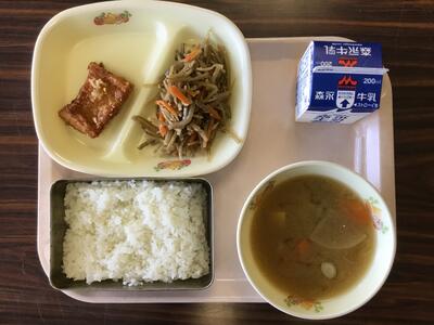 牛乳🥛 ご飯🍚 いかのさらさ揚げ きんぴらごぼう さつま汁