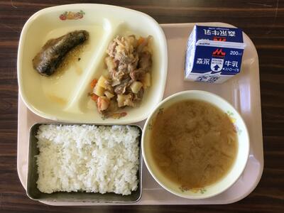 牛乳 ご飯 いわしのおろし煮 油麩入り肉じゃが だいこんとえのきたけのみそ汁