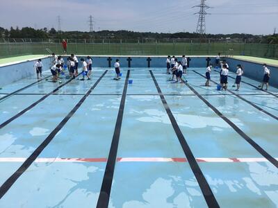 青空の下 張り切ってプール掃除です🧹 これでプールはキレイキレイ! 水泳🏊♀️の授業が始まるといよいよ夏本番です。