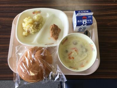 牛乳 ミルクパン 照り焼きチキン ジャーマンポテト 野菜のクリームスープ
